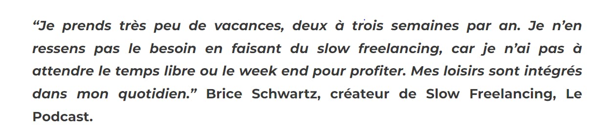 Toutefois, si cette déconnexion vous semble trop radicale, d’autres méthodes telles que le slow freelancing existent, comme l’explique Brice Scwartz, créateur de Slow Freelancing, Le Podcast :