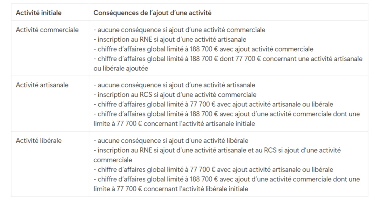 Vous pouvez ajouter plusieurs activités sur le guichet unique. Pour cela, connectez-vous et cliquez sur “créer, modifier ou cesser une entreprise”. Une fois l’établissement (la micro-entreprise) sélectionné, vous pourrez cliquer sur “ajouter une activité” au-dessus de la liste des activités déjà déclarées.