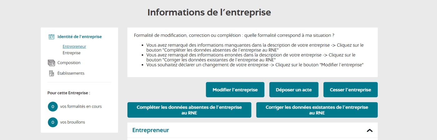 2. Puis cliquez sur modification, cessation, dépôt d’actes, correction ou complétion, en renseignant le numéro Siren ou Siret de votre micro-entreprise.