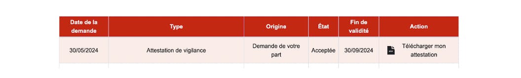 → Cliquez sur « Télécharger mon attestation » dans la colonne « Action » du tableau.