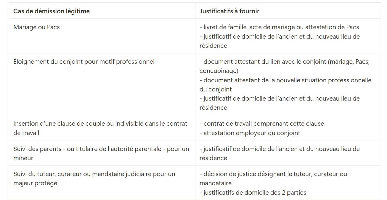 Tableau récapitulatif des cas de démission légitime et des justificatifs à fournir