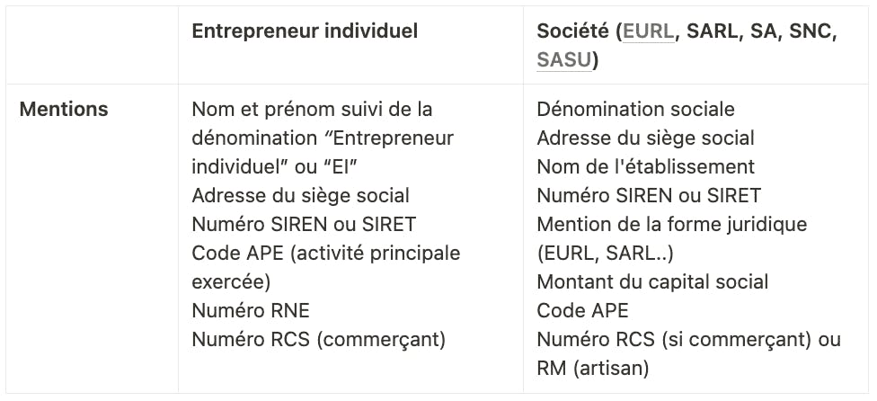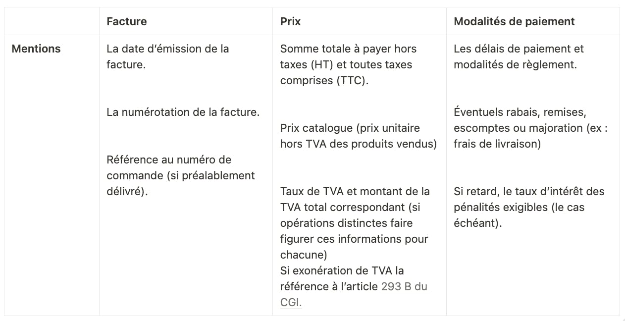 Sur toutes vos factures voici les informations qui doivent absolument apparaître :