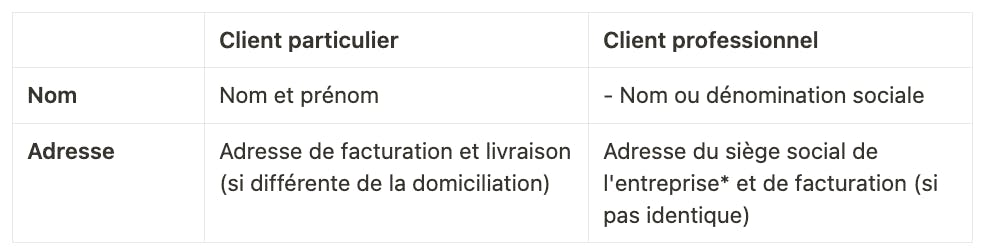 - L'adresse de livraison des biens (si elle est différente de l’adresse de facturation du client) ;
