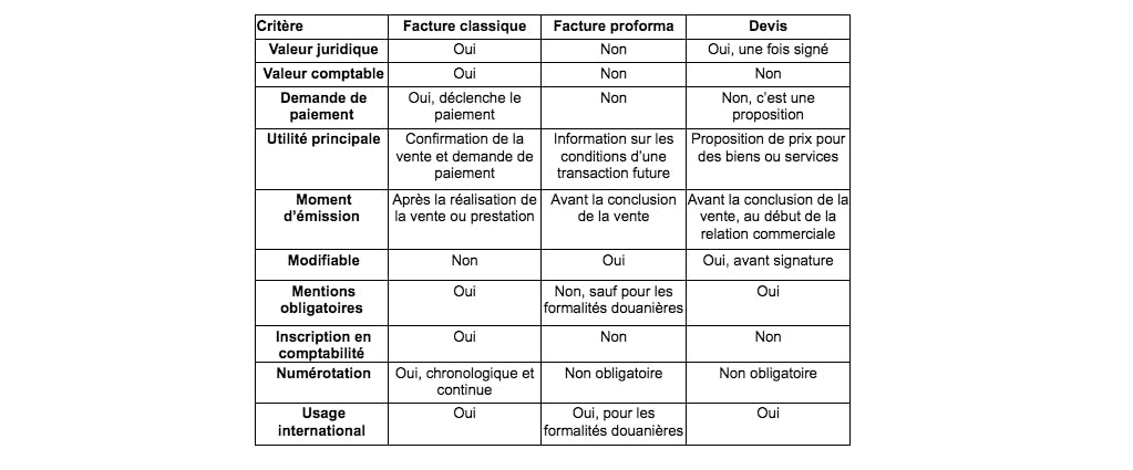 Tableau récapitulatif des différences entre une facture classique, une facture proforma et un devis