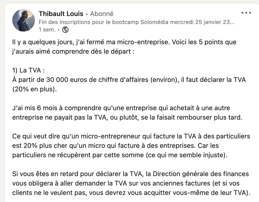 Thibault Louis, solopreneur, énonce les sujets sur lesquels il aurait préféré être formé avant de se lancer en micro-entreprise.