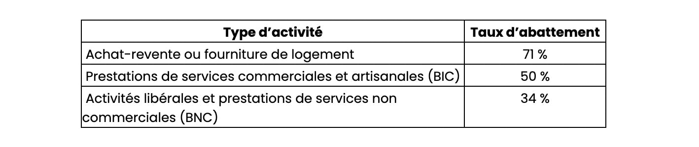 Taux d'abattement applicables sur le chiffre d’affaires pour calculer le revenu imposable dans le régime fiscal de la micro-entreprise en France.