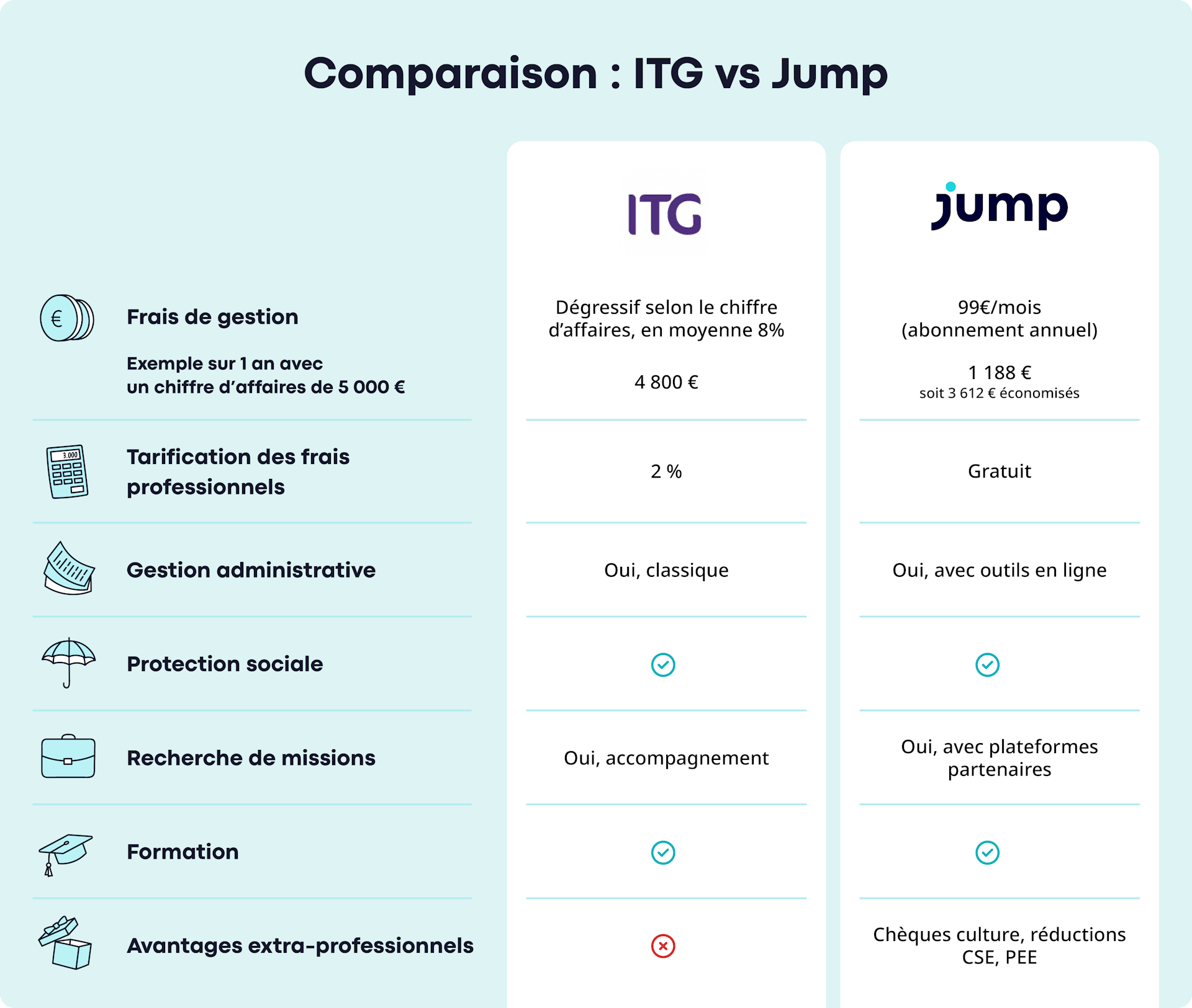L’offre est vaste au moment de choisir une société de portage salarial. Si de nombreuses similitudes sont présentes entre ces sociétés afin de respecter la convention collective en portage salarial, certains critères de différenciation sont à prendre en compte. ITG tout comme Jump font partie des sociétés les plus reconnues dans ce secteur d’activité, toutefois, elles ne proposent pas le même système de tarification. Jump est la seule société à proposer actuellement une tarification fixe (à partir de 99€/mois) quel que soit le chiffre d’affaire réalisé. Quelles sont les prestations proposées par ITG et Jump ? Comment sont calculés les frais de gestion ? Réponses dans cet article...