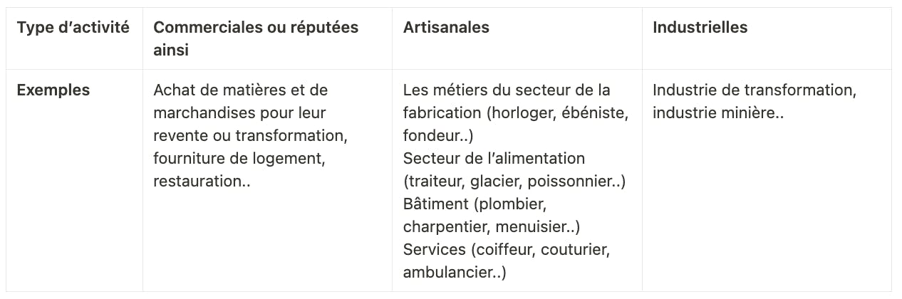 À noter Bic : les activités commerciales ou réputées comme telles, les activités artisanales ou industrielles.