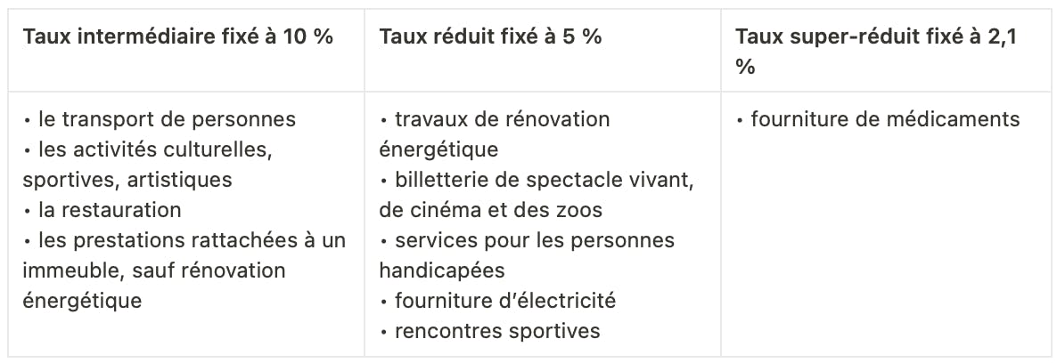 Le taux normal de TVA sur les prestations de services est de 20 %. Toutefois, certaines prestations bénéficient d’un taux inférieur. Voici quelques exemples :